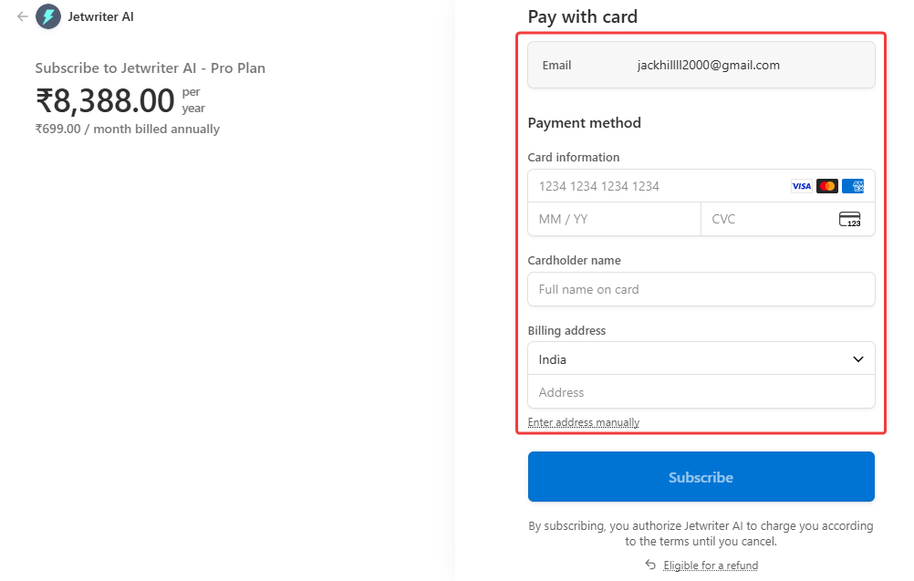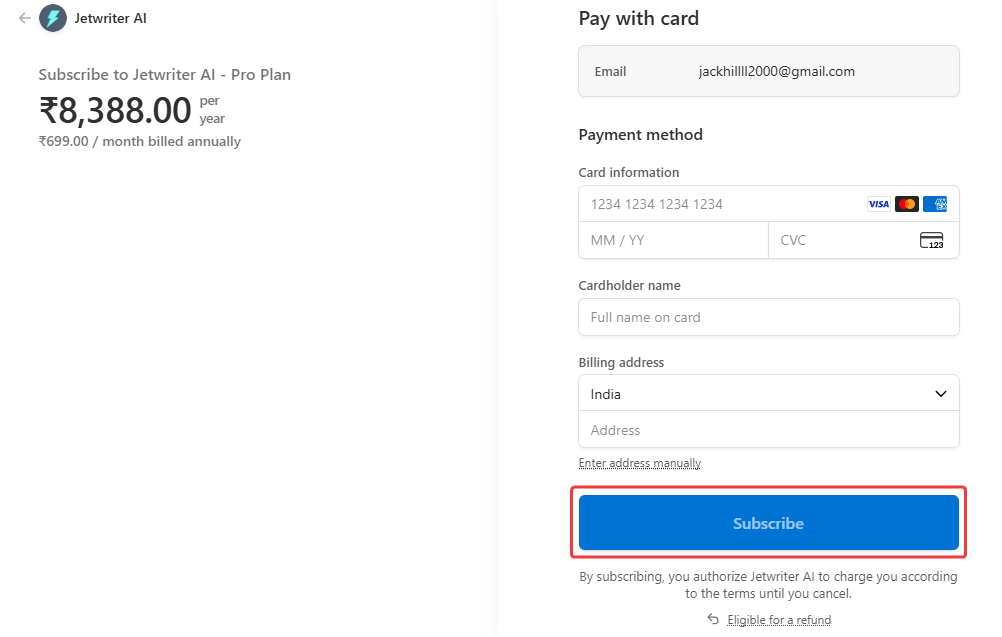 After providing the necessary payment details, double-check your information to ensure accuracy. Once everything is in order, click on the "Subscribe" button to complete your Jetwriter AI paid subscription.