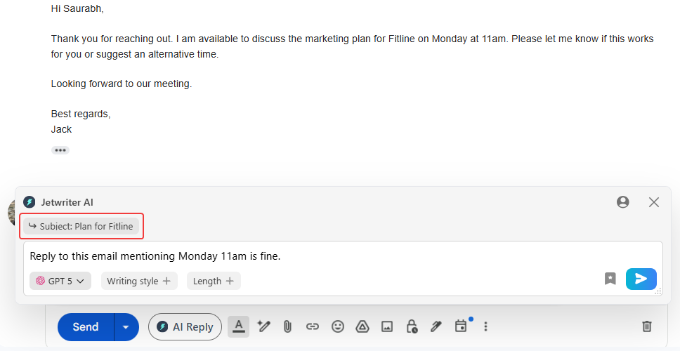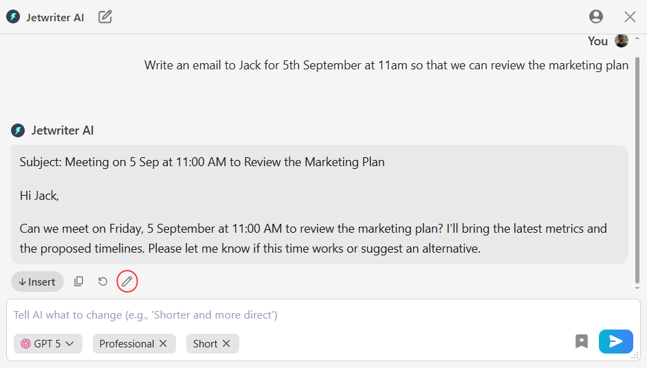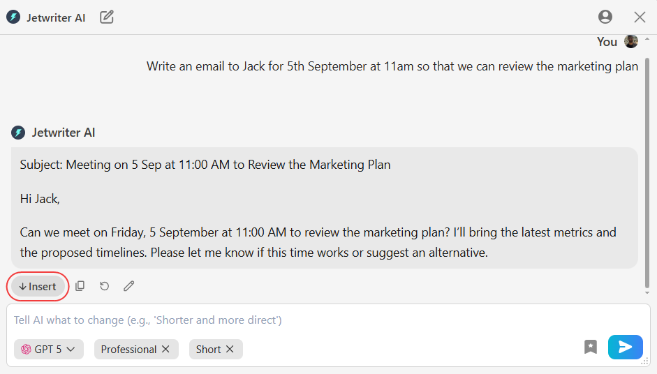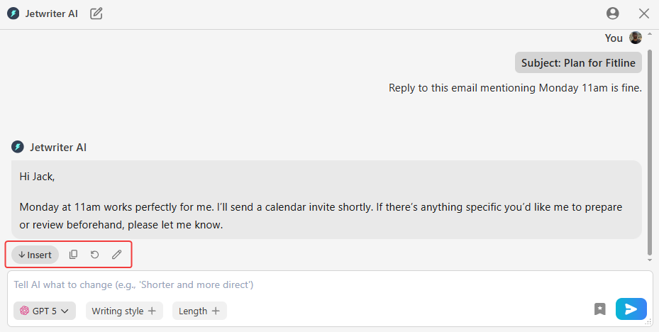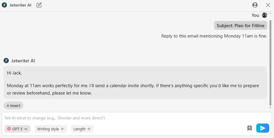 • Insert into Email: Once happy with the response, click the "Insert" button. Jetwriter AI will place the generated response into your email composition box.
