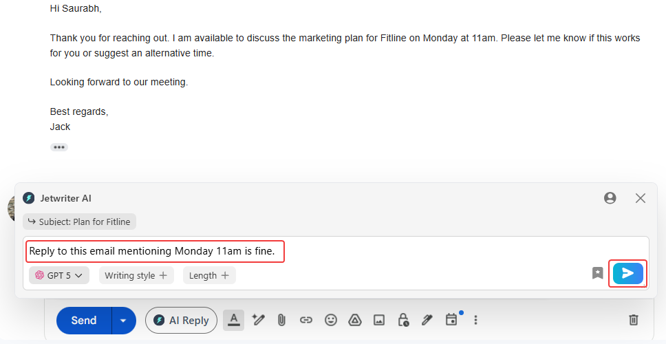 • Generate Your Reply: Briefly describe your intended reply in the tool and click the ‘Send to AI’ button. Jetwriter AI will create a response based on your input.