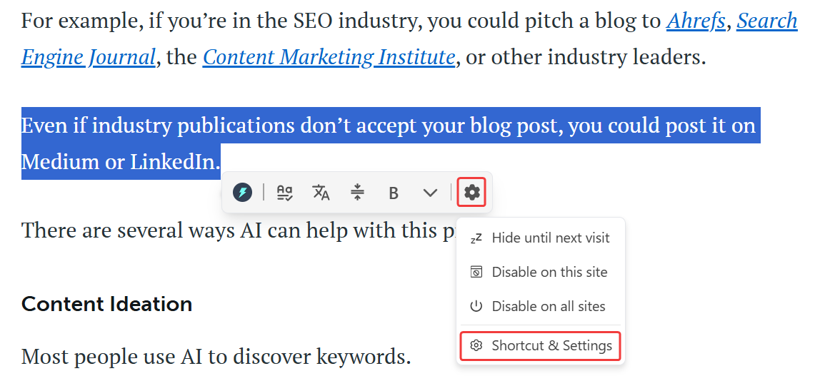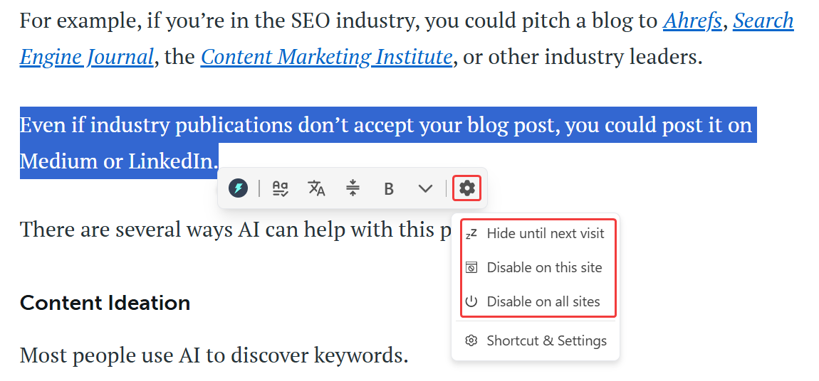- Hide the Toolbar on Specific Websites: Create a list of websites where the Quick Actions toolbar should be permanently disabled. This is useful for sites where you do not need writing assistance. If you don't want the toolbar during your current visit to a website, you can also hide the toolbar temporarily.
