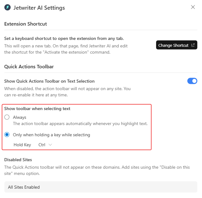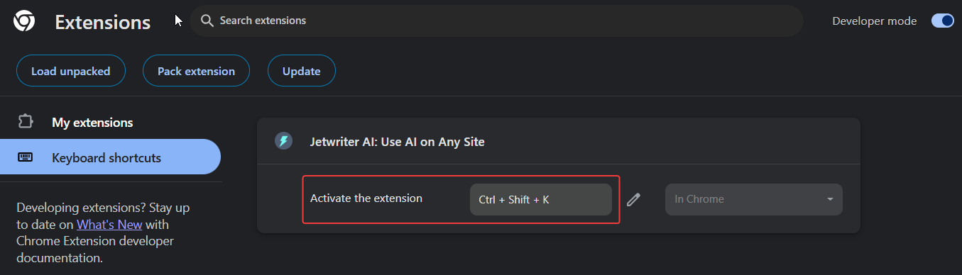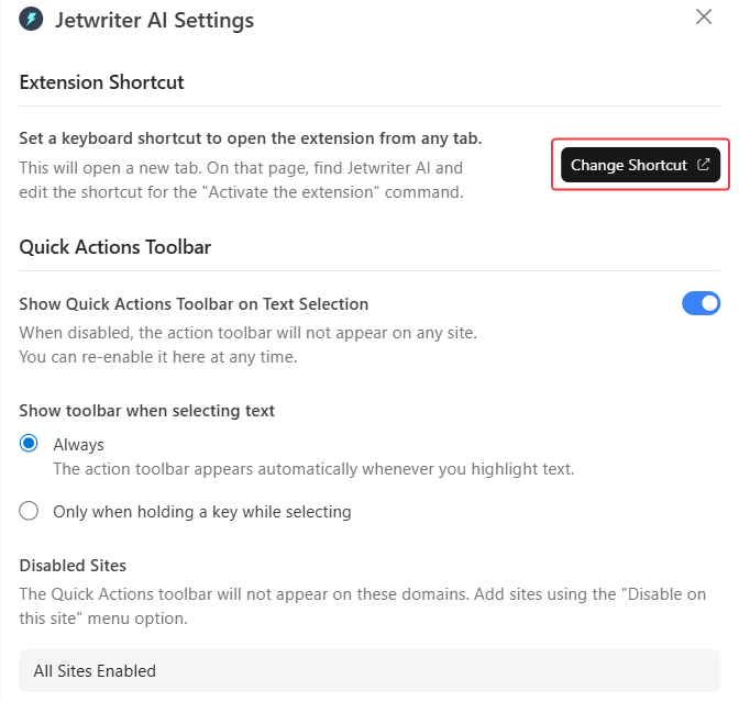 - Set a Custom Keyboard Shortcut: You can assign a custom keyboard shortcut to open the main Jetwriter AI extension window for more complex writing tasks.