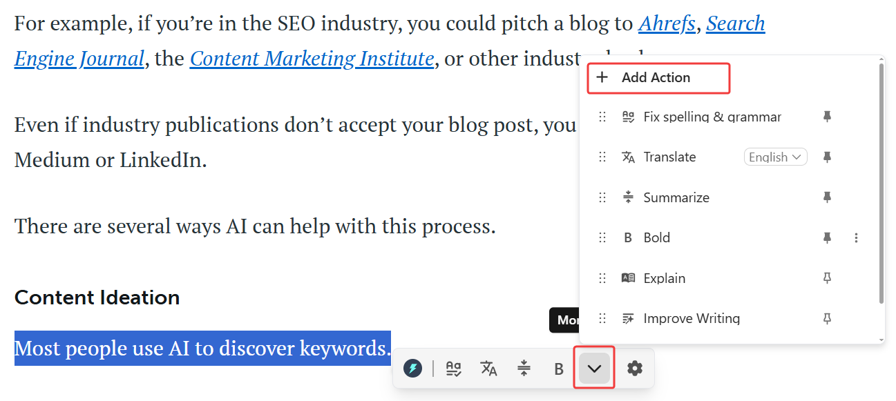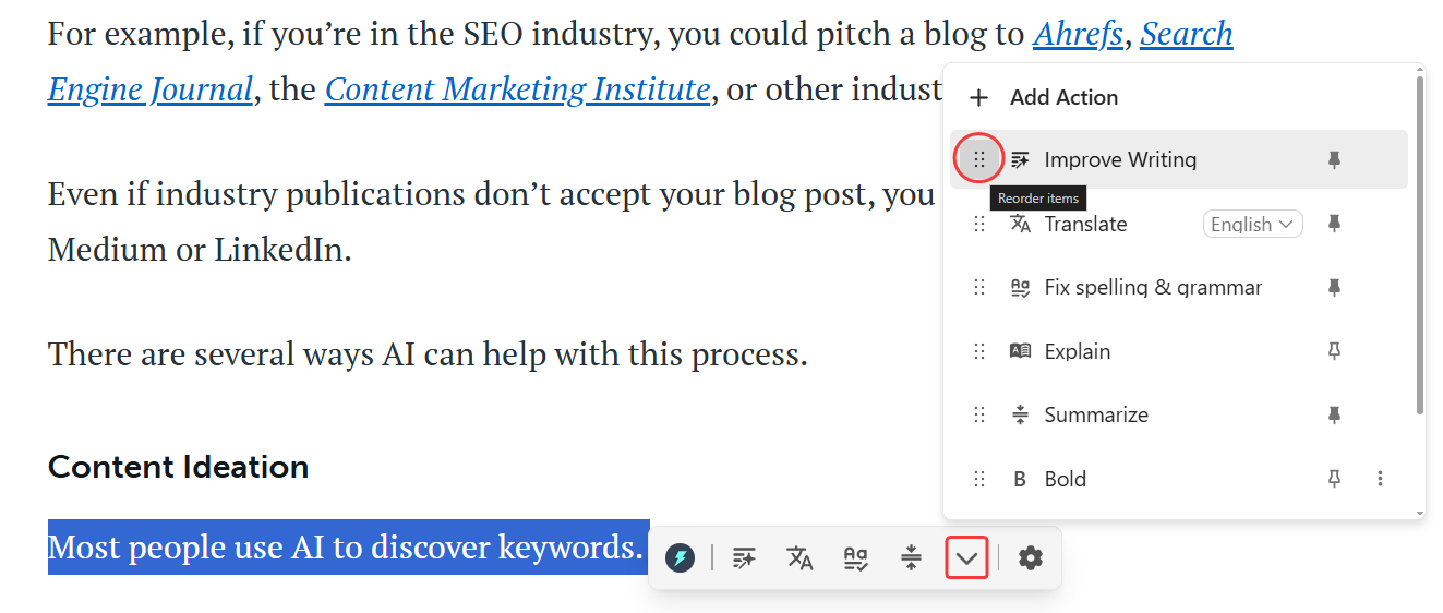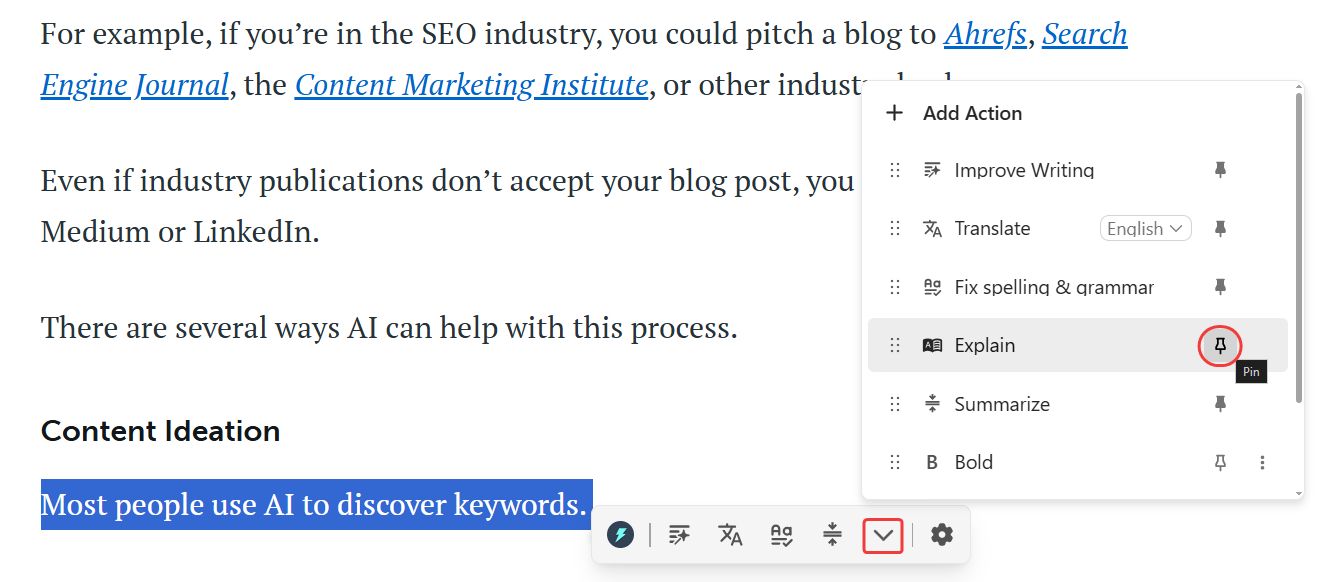 - Pin Your Favorite Actions: Pin your most-used tools, such as "Check Grammar" or "Translate," to the top of the toolbar. Pinned actions will always appear first for easy access.