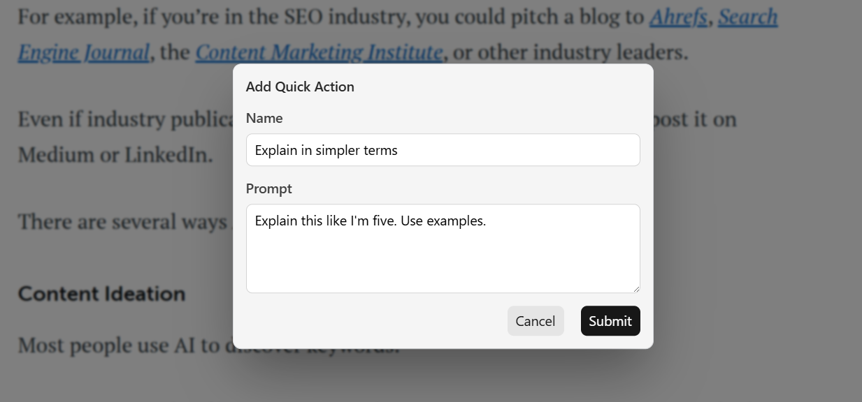 - Create a Custom Action: Save your frequently used commands as custom buttons. You can create new actions like "Convert to bullet points" or "Explain this like I'm five" for instant, one-click access.