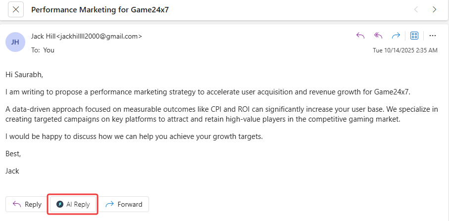Launch AI Reply: Open any email in your Outlook inbox that requires a response and click the "AI Reply" button to begin.