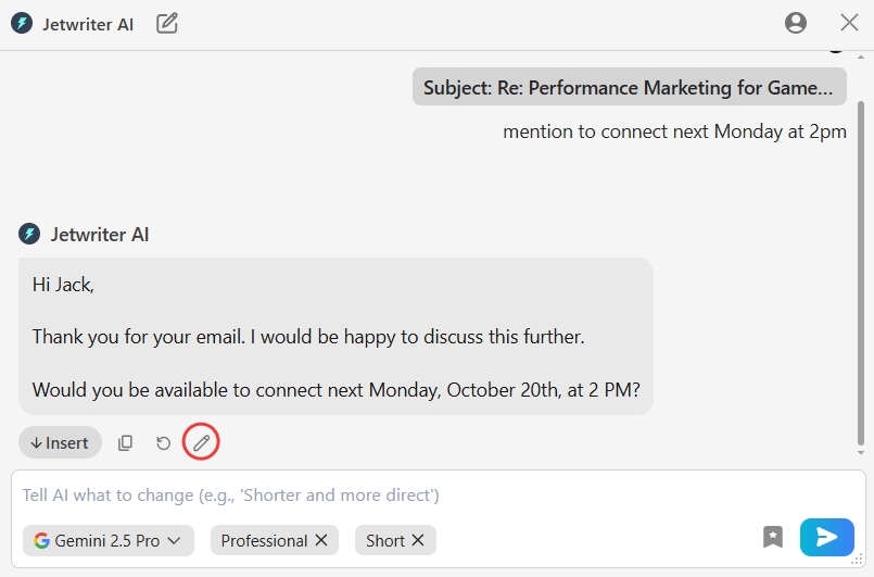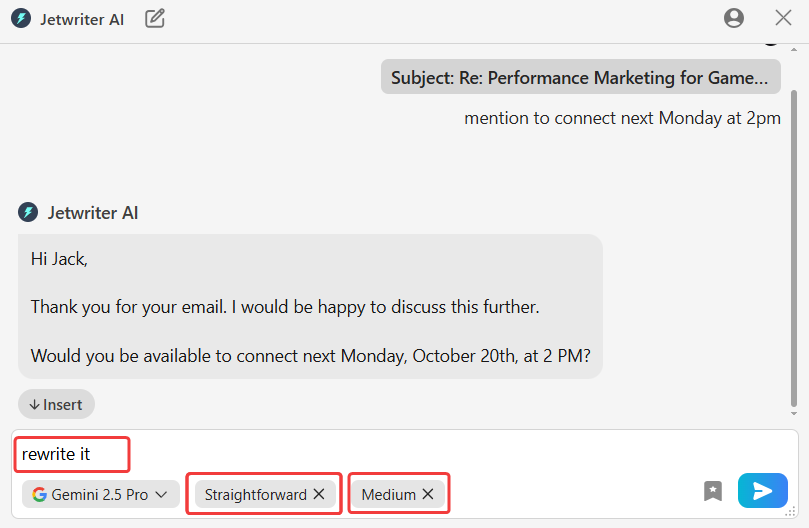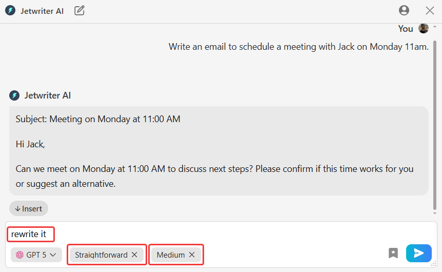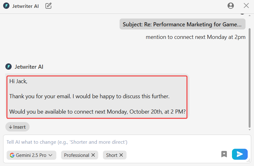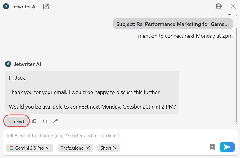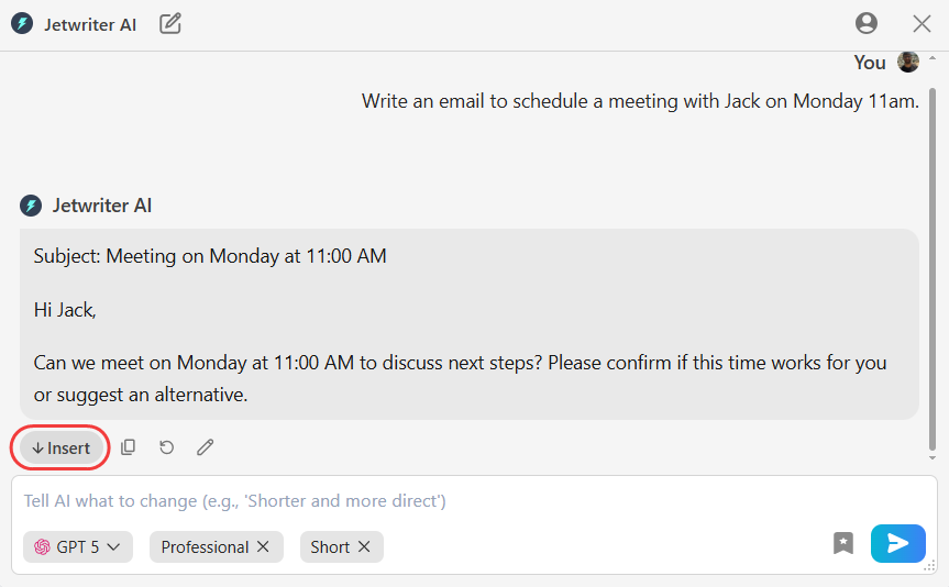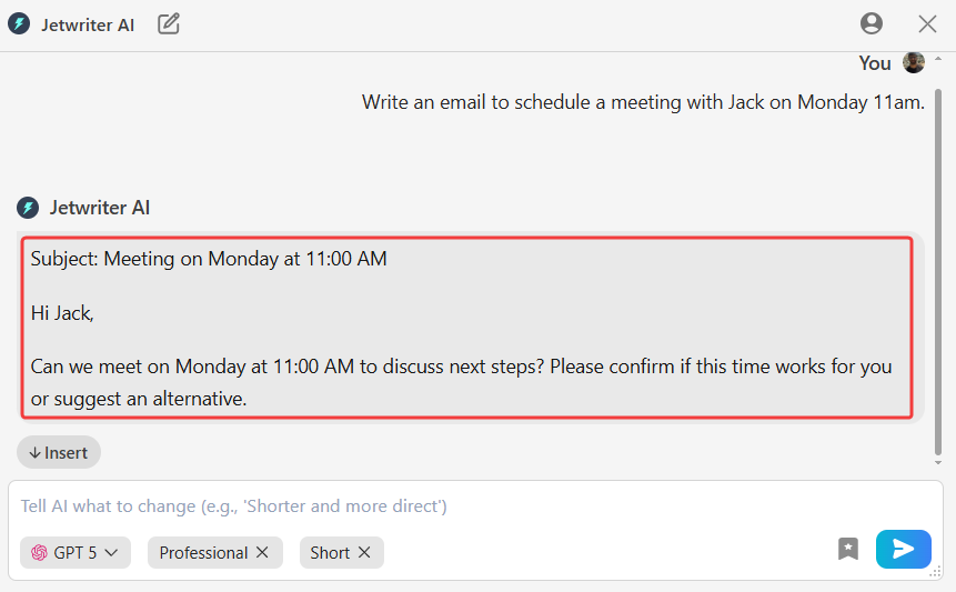 Insert the Final Text: When the draft is ready, click "Insert" to move it into your email window. Add the recipient and subject line, then send.