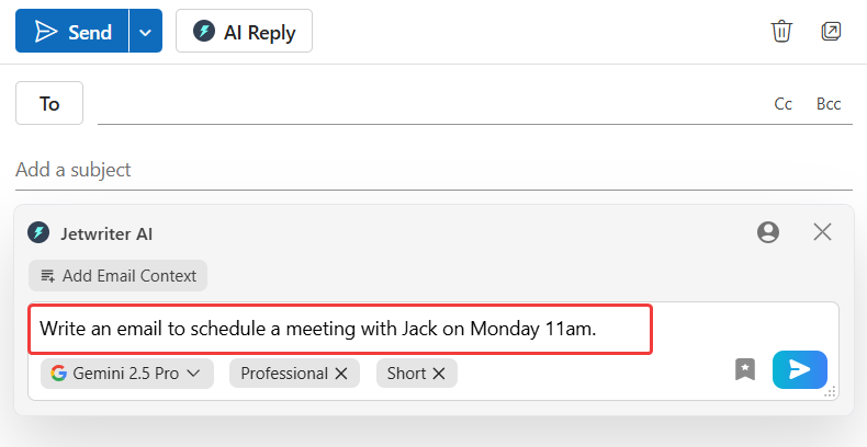 Describe the Email Content: In the input box, tell Jetwriter AI what the email should be about. For example, "Write an email to my team about the new project deadline this Friday."
