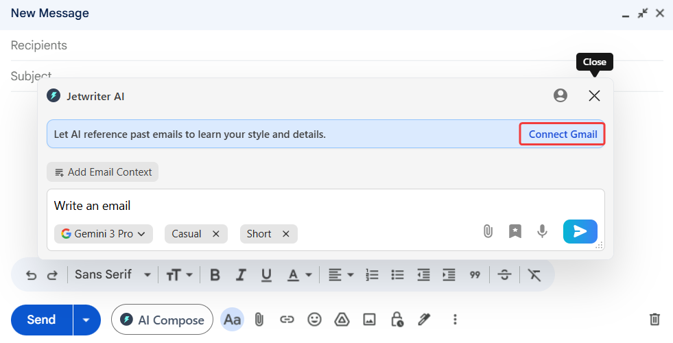 The "Connect Gmail" feature ensures that your AI assistant sounds like the best version of you, rather than a generic machine. By allowing Jetwriter AI to learn from your real-world communication, you save time on editing and can confidently send emails that reflect your true professional voice.