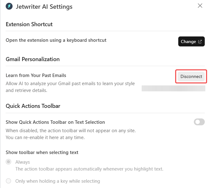 Disconnecting Gmail: If you wish to stop using the feature, navigate to your Jetwriter AI settings page, find the "Gmail Personalization" section, and click "Disconnect." The tool will stop accessing your emails immediately.