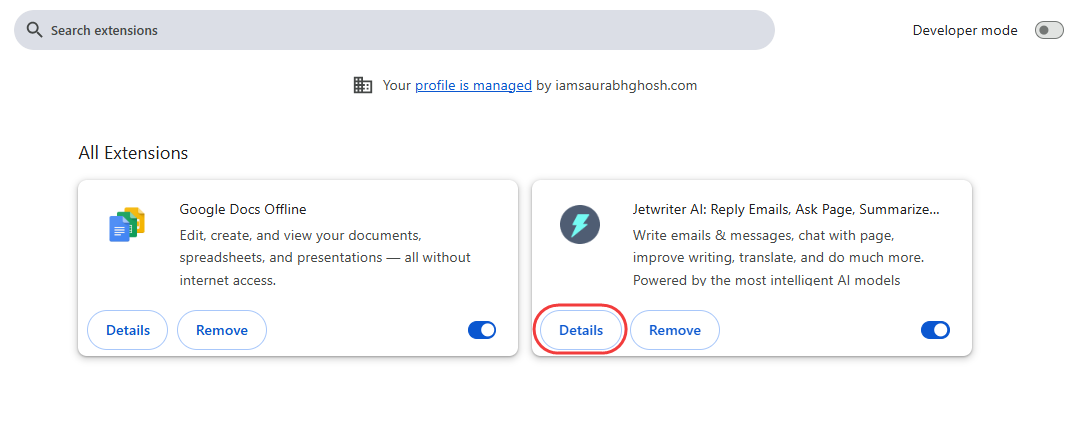 2. Find the Jetwriter AI extension in the list. Click on "Details".
