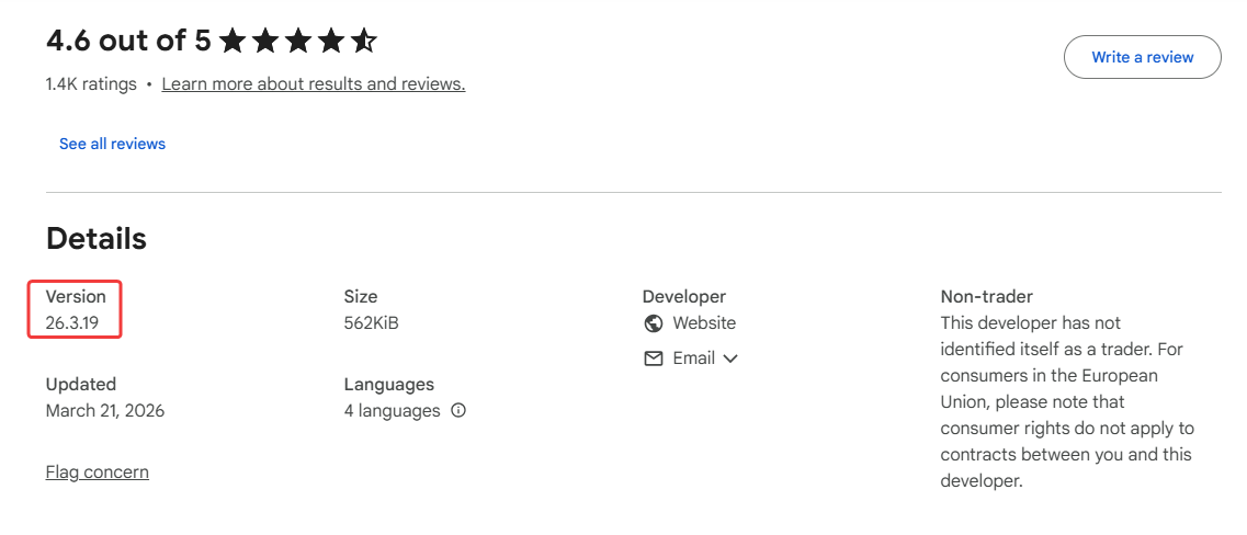 3. Next, go to the Chrome Extension page. Find the "Version". Here it is "26.3.19".