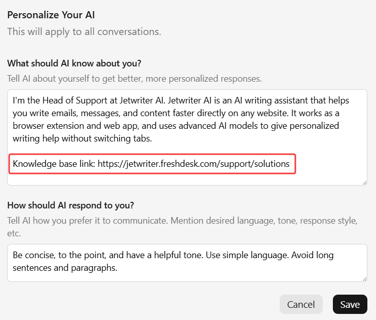 The Pro Way (Personalize AI): Add your main knowledge base or website URL directly into your "Personalize AI" profile settings. Jetwriter AI will remember this link for all future conversations and automatically reference your official documents for shipping times, troubleshooting, or return policies.