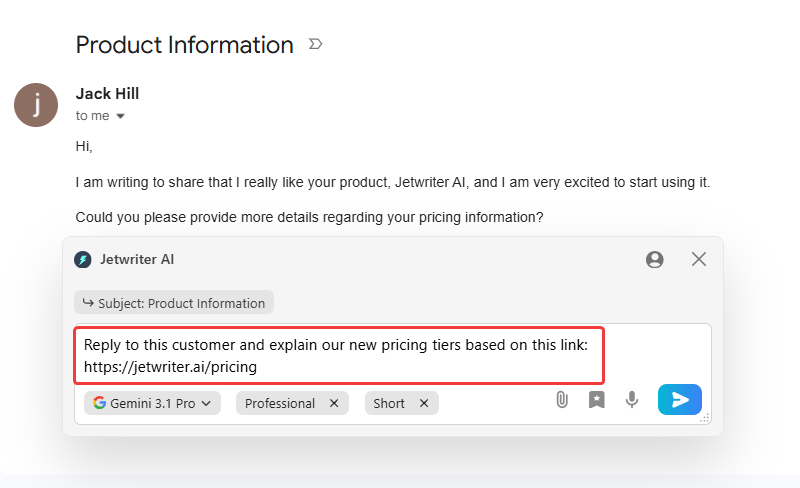 Reference Competitor Links: Ask the AI to read a specific URL to gather context. For example, type "Read this URL [Link to a competitor's product] and draft a polite email to my customer explaining why our features are better."